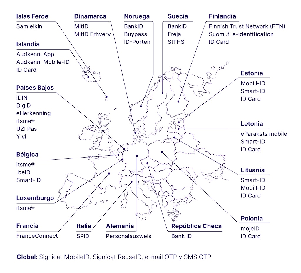 Signicat tiene acceso a más de 240 fuentes de datos para identificar empresas e individuos; desde identidades electrónicas a nivel nacional y Carteras Europeas de Identidad Digital y escaneo de documentos de identidad y verificación biométrica hasta fuentes de datos para AML y controles KYC, entre muchas otras.