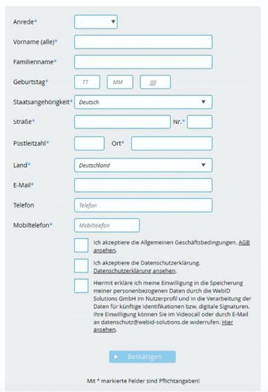 1.) Der Kunde gibt vorab auf der Website, auf der er sich registrieren möchte, einige Basisinformationen über sich ein, wie z.B. Name, Adresse, Geburtsdatum, E-Mail, und Telefonnummer. Dann liest und akzeptiert er die AGBs und die Erklärungen zum Datenschutz, das ist gesetzlich vorgeschrieben.