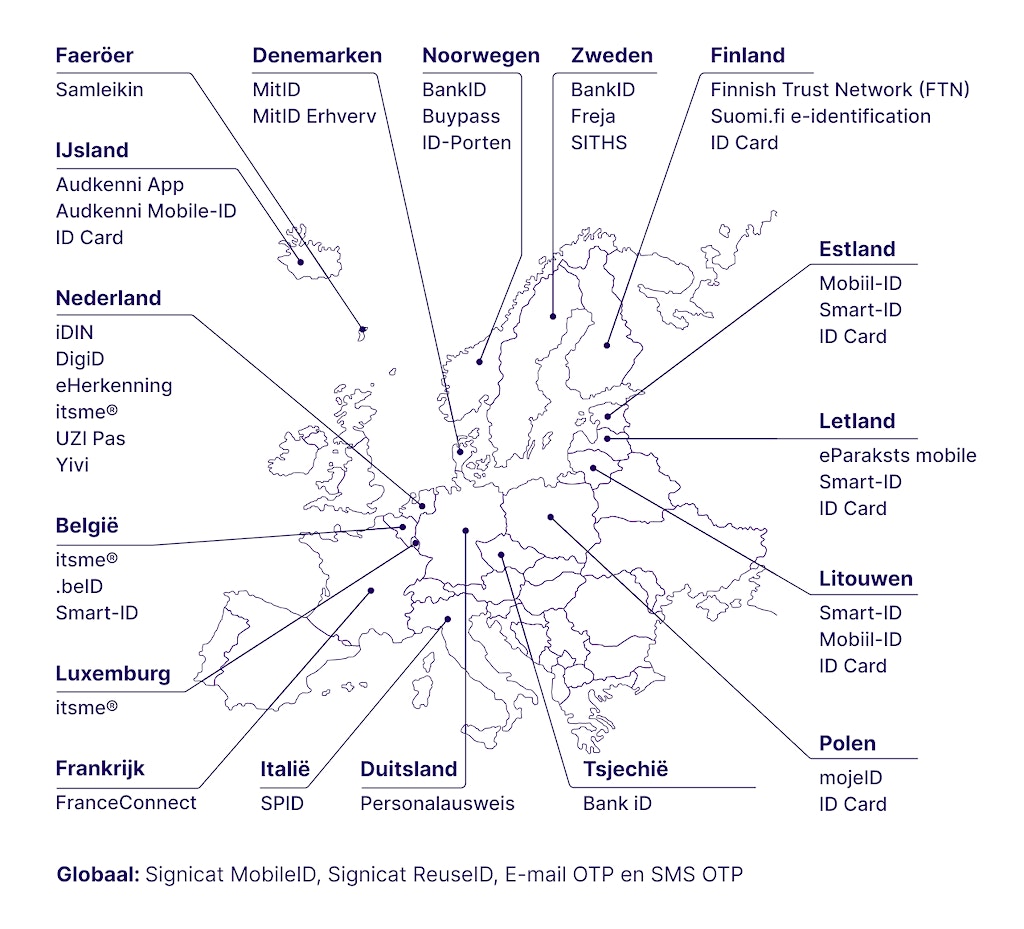 Signicat ondersteunt meer dan 240 gegevensbronnen om bedrijven en individuen te identificeren – van nationale eID's, EDI wallets, het scannen van ID-documenten en biometrische verificatie tot gegevensbronnen voor AML, KYC-controles en meer.