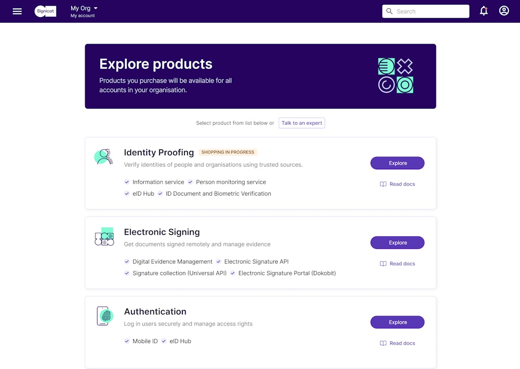 The Signicat Marketplace is available through the Dashboard – buy the products you need to go live quickly.