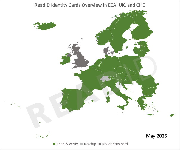 - Belgium, Bulgaria, Cyprus, Spain, France, Hungary, Italy, Luxembourg, Poland, Portugal, Croatia, Czechia, Estonia, Romania, Austria, Finland, Slovenia, Greece, Germany, Slovakia have ReadID compatible identity cards in circulation, but also non-compatible identity cards that have not yet expired.